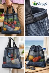 eusable mesh grocery bag with strong handles. Lightweight, washable, eco-friendly and perfect for daily vegetable and fruit shopping.